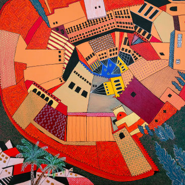 Het warme palet van oranje en rood wordt onderbroken door precieze zwarten en koele blauwen, die warmte en rust in balans brengen, terwijl de palmbomen en de geclusterde daken in de hoek linksonder een speelse, verhalende entree creëren.